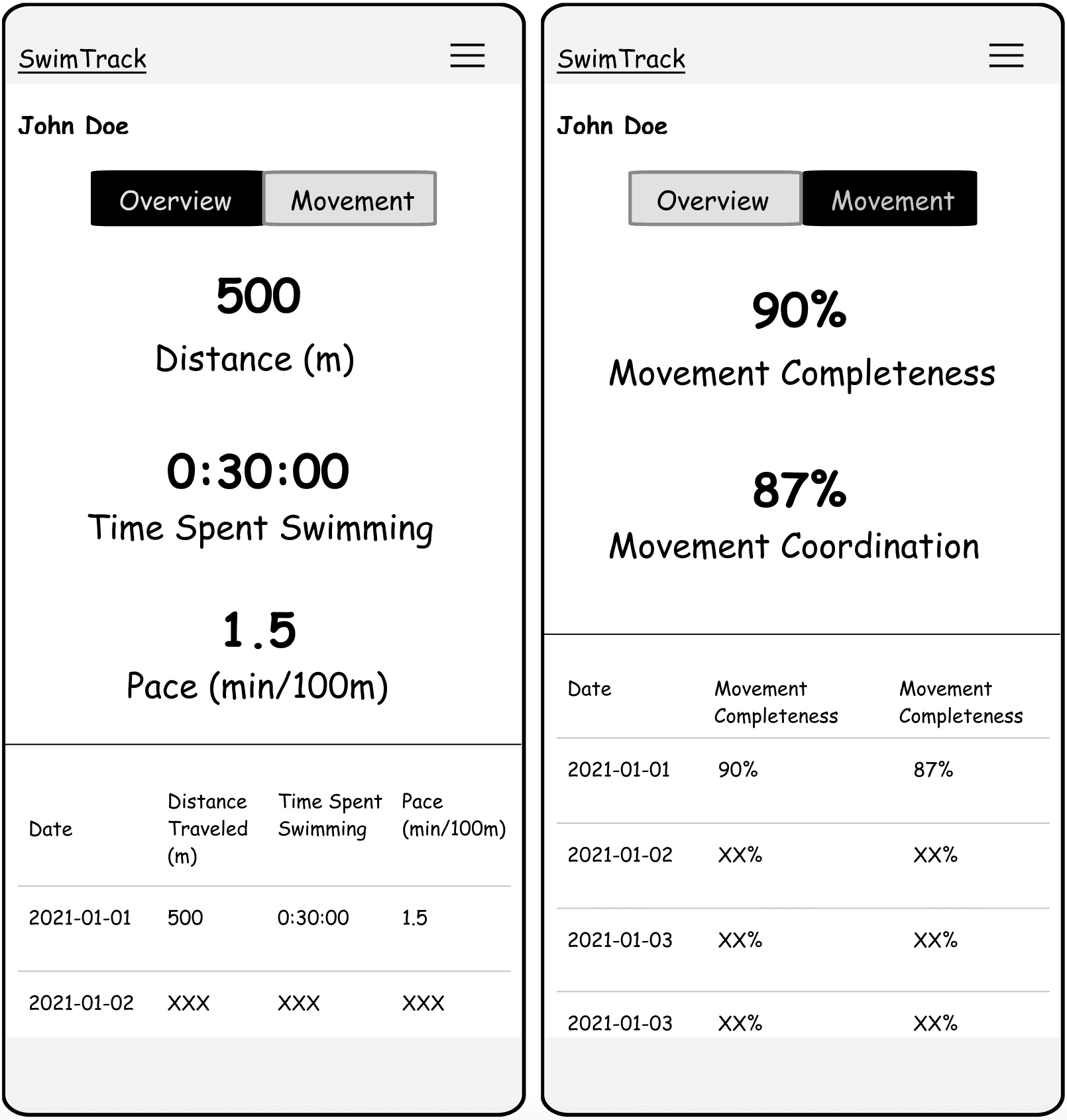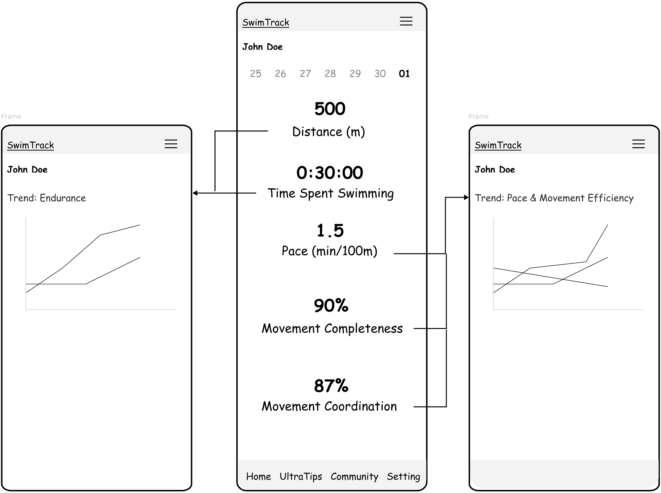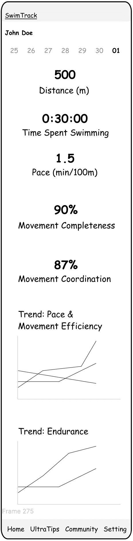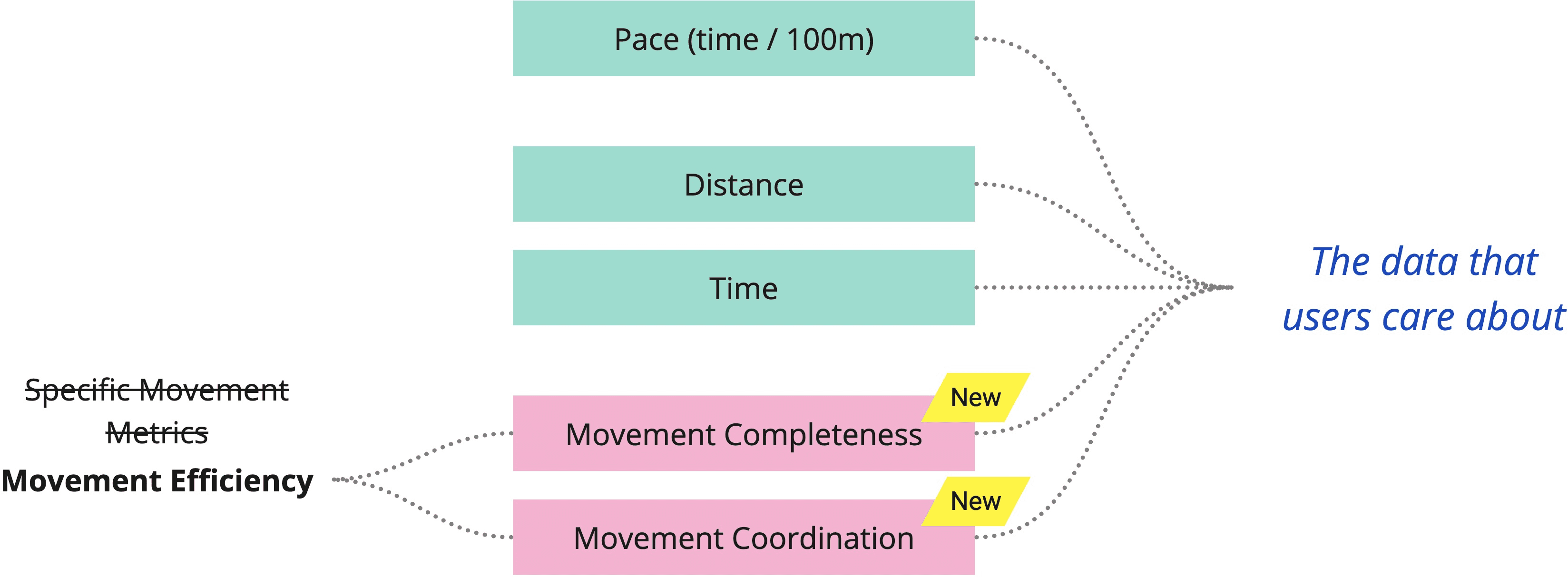 Starting with the question, "How can we show users our evaluation of their movement correctness?" I sought insights from a former swimming athlete. Through this interaction, I learned about 'Movement Efficiency,' which includes the 'Movement Completeness' metric and 'Movement Coordination' metric. These metrics offer a user-friendly way to convey the AI's assessment of the user's technique. They allow users to track their progress and strive for improvement without having to interpret specific, complex data.