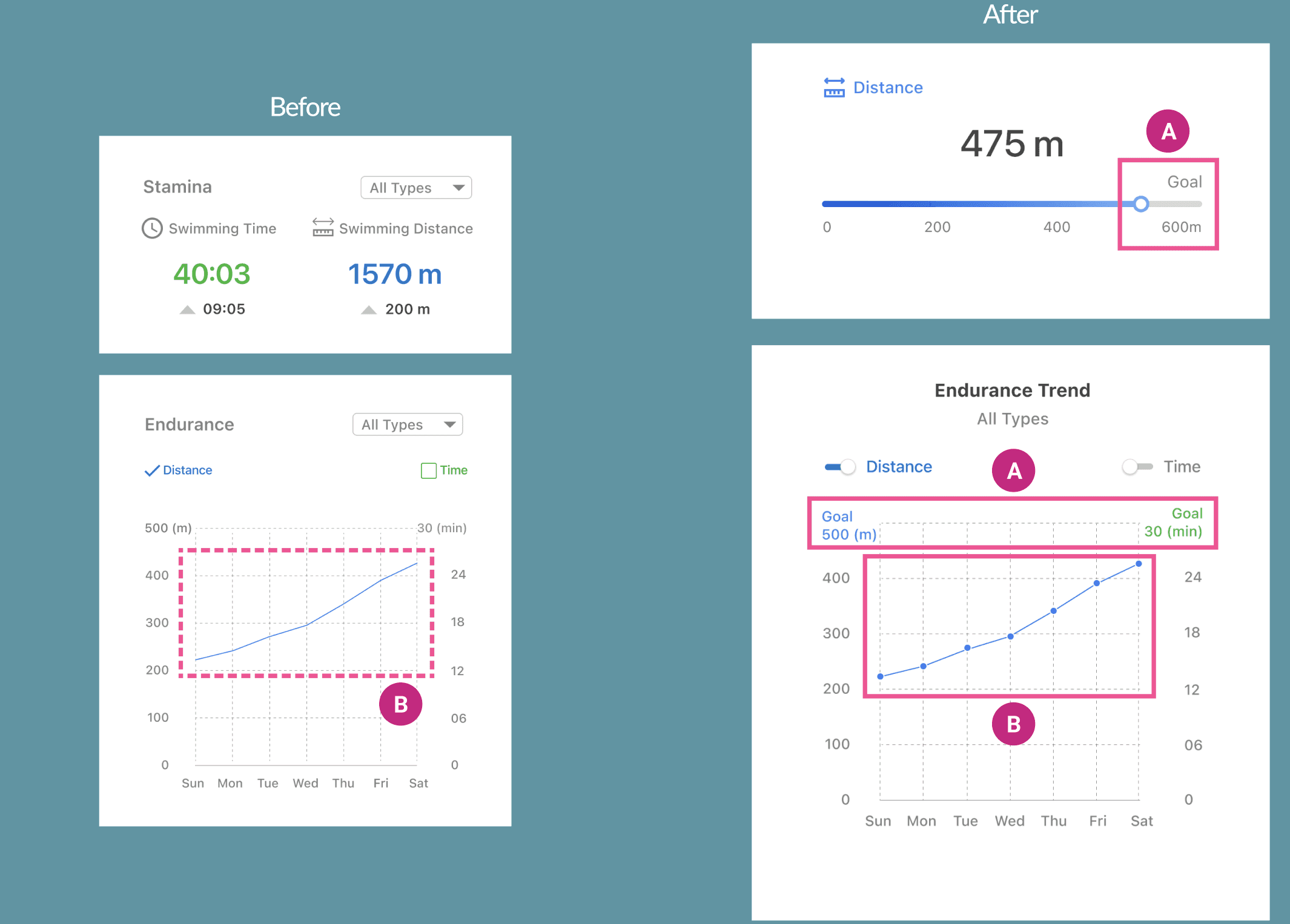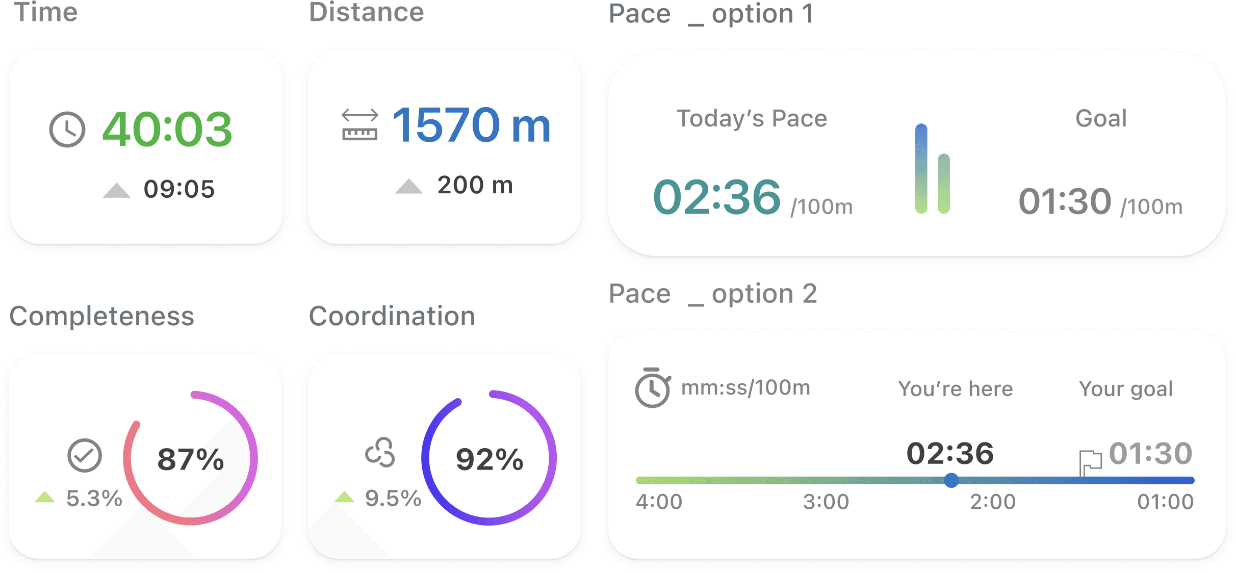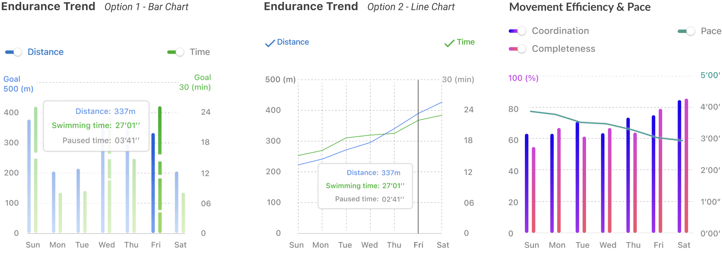 For continuous data like endurance and pace, choose line charts to reflect their ongoing trends. For discrete metrics like movement completeness/coordination, opted for bar charts to represent their discrete values. Given the flexibility of bar charts to visually represent paused time, multiple design options were created for A/B testing.